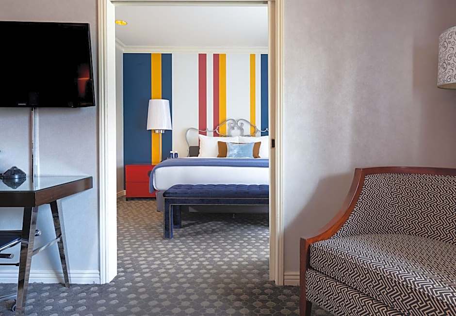 A flat-screen LCD TV with on-demand movies and an iHome alarm clock radio are provided in this suite. A soaking tub and a separate shower and boutique bath products are provided in the private bathroom.