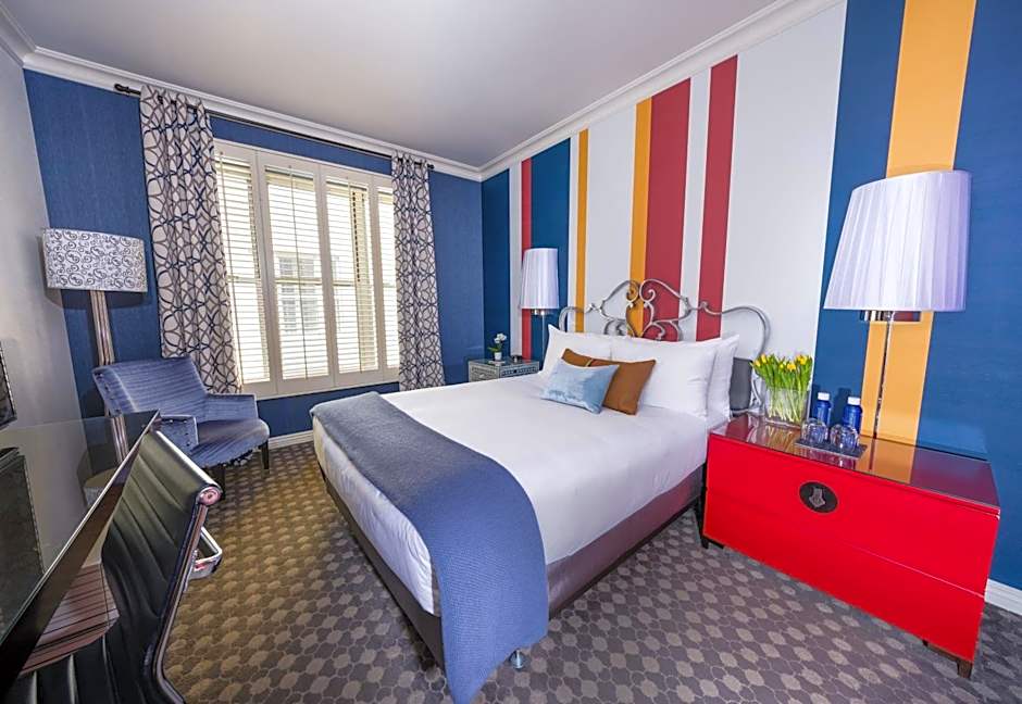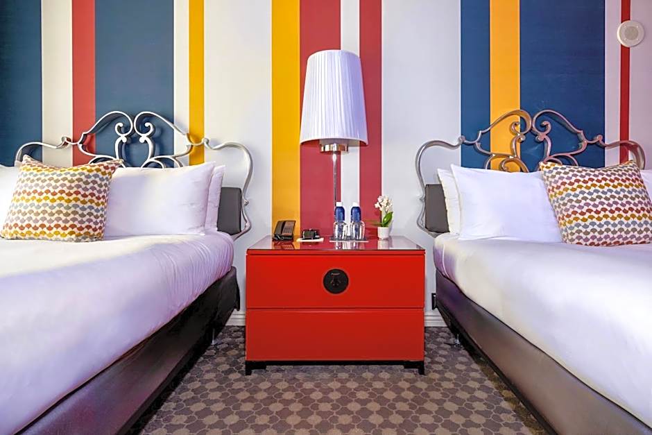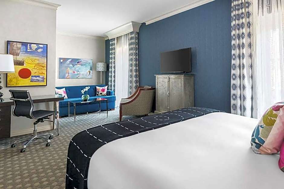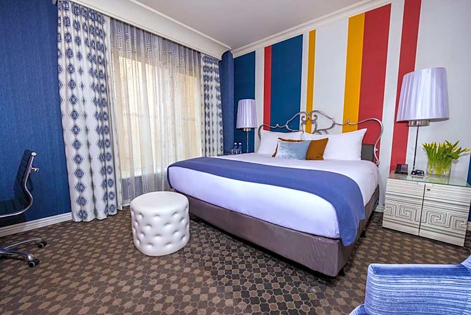 Featuring an alcove with a queen-sized pullout sofa, this spacious suite also offers a king bed with luxurious linens and pillow top bedding, complemented by tasteful blue, fuchsia and golden design accents. Cable TV with video games is offered. Luxury scented are provided in the private bathroom.